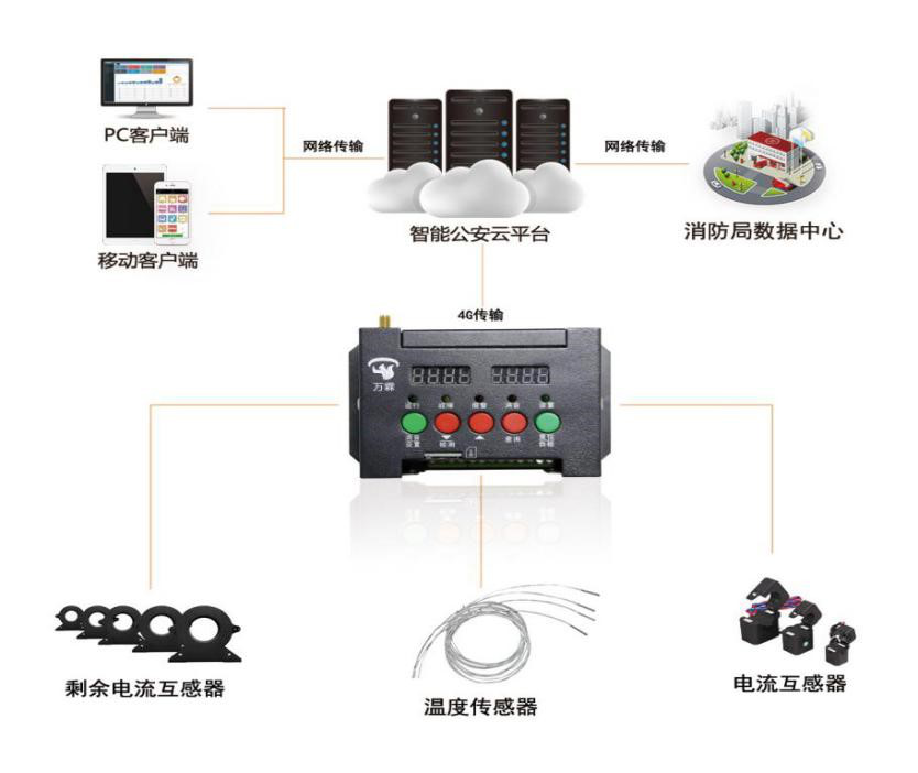 電氣火災監控系統主機自帶三路互感電流檢測,一路漏電流輸出,可接四路(八路選配)溫度傳感器、電壓值檢測(選配),可插GPRS、4G流量卡,通過流量卡實時傳輸數據到平臺服務器;簡易編程就能連平臺,直接通過手機APP綁定連接智慧用電平臺,也可以設置溫度,電流預警,可隨時翻查各線路溫度以及電流使用情況,兩路繼電器輸出,兩路485總線輸出,即可作為三相電又可作為單相電使用。
